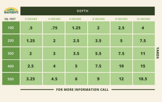 Hansen’s recommends an overall mulch depth of 3″. This depth will provide adequate feeding and moisture control for trees and shrubs. Keep in mind mulch breaks down at a rate of approximately 1″ per year, making yearly applications necessary.